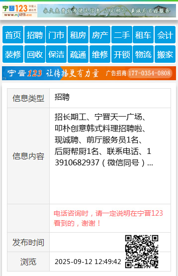 招长期工、宁晋天一广场、叩朴创意韩式料理招聘啦、现诚聘、前厅服务员1名、后厨帮厨1名、联系电话、13910682937(微信同号) 【电话咨询时,请一定说明在宁晋123看到的,谢谢!】 |
