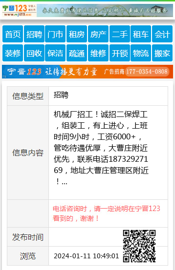 机械厂招工!诚招二保焊工,组装工,有上进心,上班时间9小时,工资6000+,管吃待遇优厚,大曹庄附近优先,联系电话18732927169,地址大曹庄管理区附近! 【电话咨询时,请一定说明在宁晋123看到的,谢谢!】 |