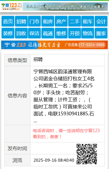 宁晋西城区韵泽通管理有限公司诺金仓储招打包女工4名,长期男工一名;要求25/50岁;手头快;吃苦耐劳;服从管理;计件工资;,(临时工忽扰)可直接来公司面试,电联15930941885.石 【电话咨询时,请一定说明在宁晋123看到的,谢谢!】 |