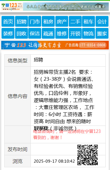 招男裤带货主播2名 要求:女(23-38岁)会说普通话、有经验者优先、有销售经验优先,口齿伶俐,形象好,逻辑思维能力强,工作地点:大曹庄管理区农场, 工作时间:6小时 工资待遇:薪资高 时间自由 想来的随时联系我(非诚勿扰)