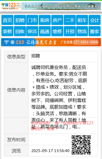 诚聘司机兼业务员,配送员,抄单业务。要求:男女不限,有责任心,吃苦耐劳,底薪+提成+绩效,划分区域,多劳多的。公司经营,山楂树下、同福碗粥、伊利雪糕等品牌。底薪加提成!要求:头脑灵活,思路清晰,有责任心,来了有人带教!地址:蔬菜市场北门,电话:15175930450(欢迎打电话咨询) 【电话咨询时,请一定说明在宁晋123看到的,谢谢!】 |
