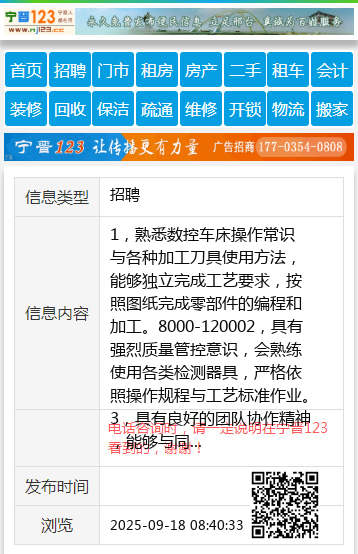 1,熟悉数控车床操作常识与各种加工刀具使用方法,能够独立完成工艺要求,按照图纸完成零部件的编程和加工。8000-120002,具有强烈质量管控意识,会熟练使用各类检测器具,严格依照操作规程与工艺标准作业。3,具有良好的团队协作精神,能够与同事有效沟通,共同解决问题4,招普工打磨打包3名工资待遇是4500-8000联系电话1500704769115227331691 【电话咨询时,请一定说明在宁晋123看到的,谢谢!】 |