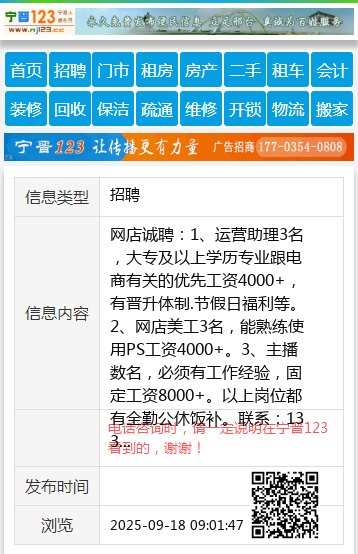 网店诚聘:1、运营助理3名,大专及以上学历专业跟电商有关的优先工资4000+,有晋升体制.节假日福利等。2、网店美工3名,能熟练使用PS工资4000+。3、主播数名,必须有工作经验,固定工资8000+。以上岗位都有全勤公休饭补。联系:13303194319 宁高路电视台西行