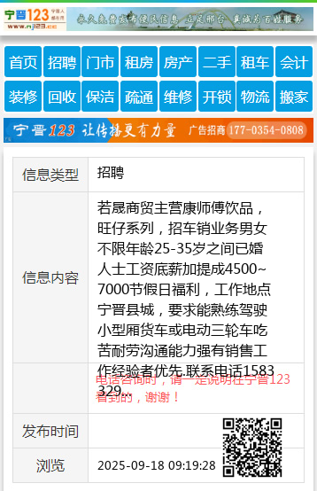 若晟商贸主营康师傅饮品,旺仔系列,招车销业务男女不限年龄25-35岁之间已婚人士工资底薪加提成4500~7000节假日福利,工作地点宁晋县城,要求能熟练驾驶小型厢货车或电动三轮车吃苦耐劳沟通能力强有销售工作经验者优先.联系电话15833297307, 【电话咨询时,请一定说明在宁晋123看到的,谢谢!】 |