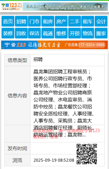晶龙集团招聘工程审核员;医养公司招聘行政专员、市场专员、市场经营部经理;晶龙地产物业公司招聘商旅公司经理、水电监审员、消防中控员;晶龙餐饮公司招聘安全质检经理、人事经理、人事专员、采购员;晶龙大酒店招聘餐厅经理、厨师长、烘焙运营经理;晶龙物流公司招聘进出口操作主管,岗位多多,有意者电话联系:03195856130 【电话咨询时,请一定说明在宁晋123看到的,谢谢!】 |