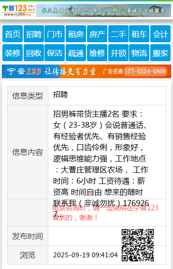 招男裤带货主播2名 要求:女(23-38岁)会说普通话、有经验者优先、有销售经验优先,口齿伶俐,形象好,逻辑思维能力强,工作地点:大曹庄管理区农场, 工作时间:6小时 工资待遇:薪资高 时间自由 想来的随时联系我(非诚勿扰)