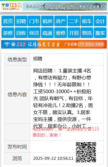 网店招聘: 1.童装主播 4名,有想法有能力,有野心想挣钱!!!无年龄限制!!工资5000-10000++积极阳光 团队有朝气,有目标,年轻有冲劲儿!2.助播2名,男女不限,踏实认真。3.居家宝妈主播,提供货源,一件代发,居家办公,小时工 有工作经验者优先录用!!!男女不限。地址:东亚 菜市场 大医院附近 县城 ,联系电话:15533197597 【电话咨询时,请一定说明在宁晋123看到的,谢谢!】 |