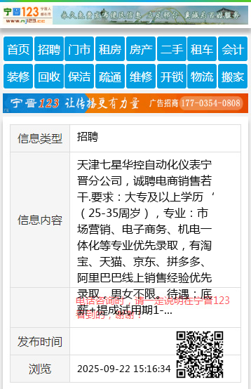 天津七星华控自动化仪表宁晋分公司,诚聘电商销售若干.要求:大专及以上学历‘(25-35周岁),专业:市场营销、电子商务、机电一体化等专业优先录取,有淘宝、天猫、京东、拼多多、阿里巴巴线上销售经验优先录取,男女不限。待遇:底薪+提成试用期1-3个月.3000/月+提成.要求踏实肯干,有上进心..每天工作八个小时.五险.节假日全休.实行单双休,工作地点:方大科技园,如有想法可以与我们联系,联系电话:13752055332刘经理.17867425860罗经理 【电话咨询时,请一定说明在宁晋123看到的,谢谢!】 |