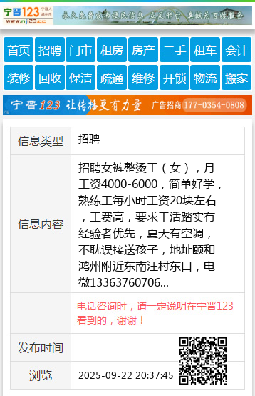 招聘女裤整烫工(女),月工资4000-6000,简单好学,熟练工每小时工资20块左右,工费高,要求干活踏实有经验者优先,夏天有空调,不耽误接送孩子,地址颐和鸿州附近东南汪村东口,电微13363760706 【电话咨询时,请一定说明在宁晋123看到的,谢谢!】 |