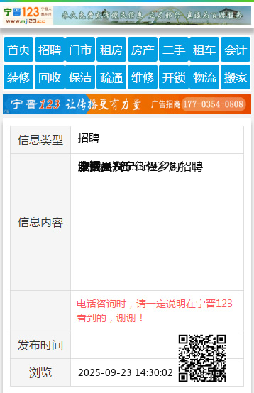 宁晋县兴宁街怪乡厨招聘 收银员1名 服务员2名 洗碗工1名 工资面议 电话:13653392287