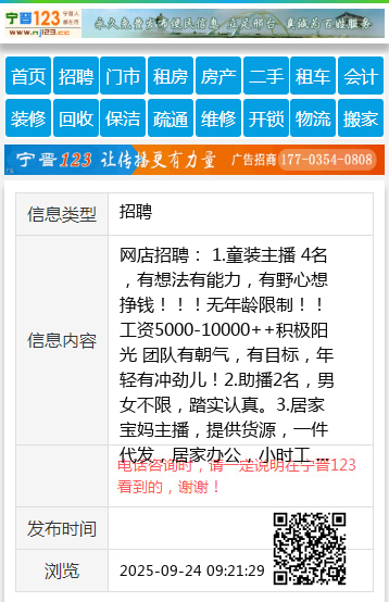 网店招聘: 1.童装主播 4名,有想法有能力,有野心想挣钱!!!无年龄限制!!工资5000-10000++积极阳光 团队有朝气,有目标,年轻有冲劲儿!2.助播2名,男女不限,踏实认真。3.居家宝妈主播,提供货源,一件代发,居家办公,小时工 有工作经验者优先录用!!!男女不限。地址:东亚 菜市场 大医院附近 县城 ,联系电话:15533197597 【电话咨询时,请一定说明在宁晋123看到的,谢谢!】 |