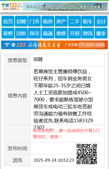 若晟商贸主营康师傅饮品,旺仔系列,招车销业务男女不限年龄25-35岁之间已婚人士工资底薪加提成4500~7000,要求能熟练驾驶小型厢货车或电动三轮车吃苦耐劳沟通能力强有销售工作经验者优先.联系电话15833297307, 【电话咨询时,请一定说明在宁晋123看到的,谢谢!】 |