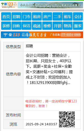 会计公司招聘:营销会计,招长期、只招女士,40岁以下。底薪+奖金+社保+全勤奖+交通补贴+公司福利;提成上不封顶;欢迎您的加入!18132913900同微fghj