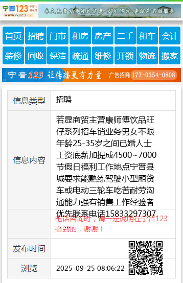 若晟商贸主营康师傅饮品旺仔系列招车销业务男女不限年龄25-35岁之间已婚人士工资底薪加提成4500~7000节假日福利工作地点宁晋县城要求能熟练驾驶小型厢货车或电动三轮车吃苦耐劳沟通能力强有销售工作经验者优先联系电话15833297307, 【电话咨询时,请一定说明在宁晋123看到的,谢谢!】 |