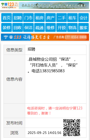 .县城物业公司招“保洁”,“开扫地车人员”,“保安”。电话13831985083