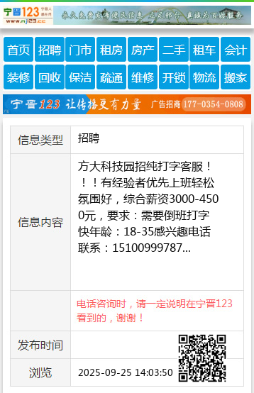 | 防骗提醒: | 宁晋123(www.nj123.cc)提醒您:手工活、网络兼职、刷单,都是骗子!凡以各种名义收取费用的都是骗子!找工作是往兜里挣钱,让你往外掏钱的都是骗子!异地招聘请提高警惕,谨防诈骗! |