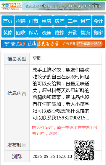 纯手工鲜水饺,朋友们喜欢吃饺子的自己在家没时间包的可以交给我,份量足味道美,原材料每天选用新鲜的前腿肉和蔬菜,调味品也没有任何的添加,老人小孩孕妇可以放心吃想吃什么馅的可以联系我15932090215 【电话咨询时,请一定说明在宁晋123看到的,谢谢!】 |