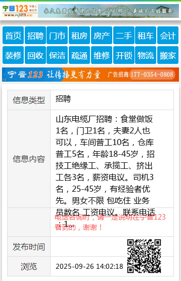 山东电缆厂招聘:食堂做饭1名,门卫1名,夫妻2人也可以,车间普工10名,仓库普工5名,年龄18-45岁,招技工绝缘工、承揽工、挤出工各3名,薪资电议。司机3名,25-45岁,有经验者优先。男女不限 包吃住 业务员数名 工资电议。联系电话:13675411866/15031941667 【电话咨询时,请一定说明在宁晋123看到的,谢谢!】 |