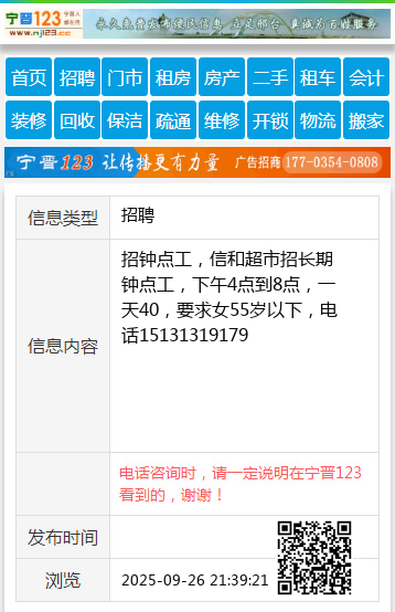 招钟点工,信和超市招长期钟点工,下午4点到8点,一天40,要求女55岁以下,电话15131319179