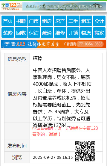 中国人寿招聘售后服务、人事助理岗,男女不限,底薪4000加提成,收入上不封顶,长白班,单休,提供外出及内部培养成长机遇,招满根据需要随时截止,先到先得。