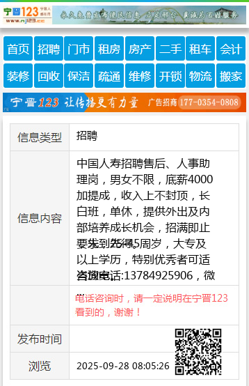 中国人寿招聘售后、人事助理岗,男女不限,底薪4000加提成,收入上不封顶,长白班,单休,提供外出及内部培养成长机会,招满即止,先到先得。