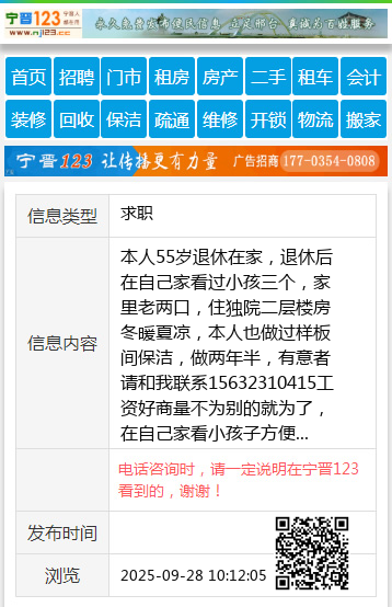 本人55岁退休在家,退休后在自己家看过小孩三个,家里老两口,住独院二层楼房冬暖夏凉,本人也做过样板间保洁,做两年半,有意者请和我联系15632310415工资好商量不为别的就为了,在自己家看小孩子方便 【电话咨询时,请一定说明在宁晋123看到的,谢谢!】 |
