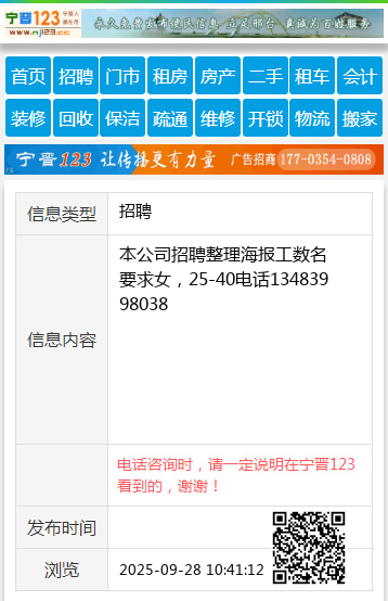 本公司招聘整理海报工数名要求女,25-40电话13483998038