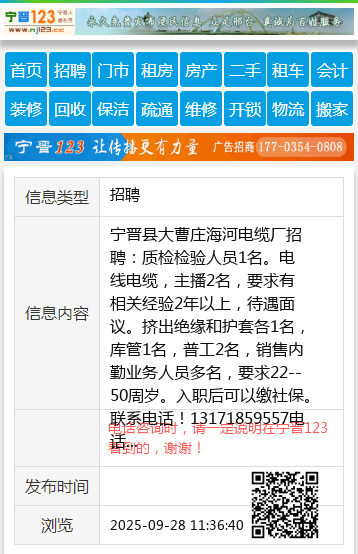 宁晋县大曹庄海河电缆厂招聘:质检检验人员1名。电线电缆,主播2名,要求有相关经验2年以上,待遇面议。挤出绝缘和护套各1名,库管1名,普工2名,销售内勤业务人员多名,要求22--50周岁。入职后可以缴社保。联系电话!13171859557电话5567077 【电话咨询时,请一定说明在宁晋123看到的,谢谢!】 |