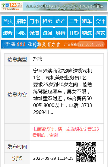 宁晋兴澳商贸招聘:送货司机1名,司机兼职业务员1名,要求25岁到40岁之间,能熟练驾驶包厢车,男女不限,地址童泰附近,综合薪资5000到8000以上,电话13733296941 【电话咨询时,请一定说明在宁晋123看到的,谢谢!】 |
