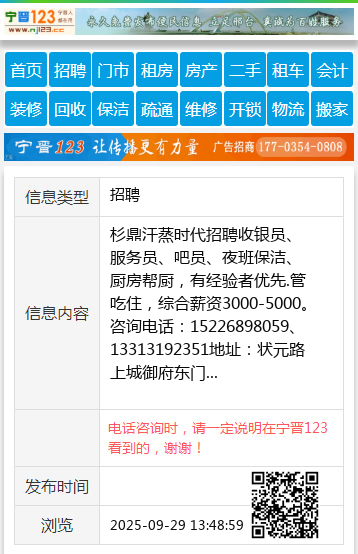 杉鼎汗蒸时代招聘收银员、服务员、吧员、夜班保洁、厨房帮厨,有经验者优先.管吃住,综合薪资3000-5000。咨询电话:15226898059、13313192351地址:状元路上城御府东门 【电话咨询时,请一定说明在宁晋123看到的,谢谢!】 |