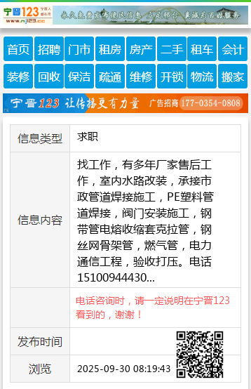 找工作,有多年厂家售后工作,室内水路改装,承接市政管道焊接施工,PE塑料管道焊接,阀门安装施工,钢带管电熔收缩套克拉管,钢丝网骨架管,燃气管,电力通信工程,验收打压。电话15100944430 【电话咨询时,请一定说明在宁晋123看到的,谢谢!】 |