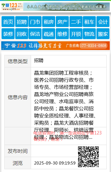 晶龙集团招聘工程审核员;医养公司招聘行政专员、市场专员、市场经营部经理;晶龙地产物业公司招聘商旅公司经理、水电监审员、消防中控员;晶龙餐饮公司招聘安全质检经理、人事经理、采购员;晶龙大酒店招聘餐厅经理、厨师长、烘焙运营经理;晶龙物流公司招聘进出口操作主管,岗位多多,有意者电话联系:03195856130 【电话咨询时,请一定说明在宁晋123看到的,谢谢!】 |