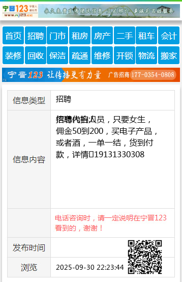 | 防骗提醒: | 宁晋123(www.nj123.cc)提醒您:手工活、网络兼职、刷单,都是骗子!凡以各种名义收取费用的都是骗子!找工作是往兜里挣钱,让你往外掏钱的都是骗子!异地招聘请提高警惕,谨防诈骗! |