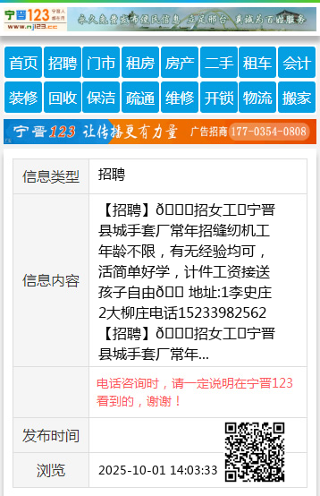 【招聘】🎉招女工✅宁晋县城手套厂常年招缝纫机工年龄不限,有无经验均可,活简单好学,计件工资接送孩子自由🏠地址:1李史庄2大柳庄电话15233982562【招聘】🎉招女工✅宁晋县城手套厂常年 【电话咨询时,请一定说明在宁晋123看到的,谢谢!】 |