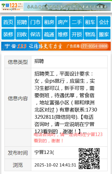 招聘美工,平面设计要求:女,会ps就行,应届生,实习生都可以,新手可带,需要倒班,待遇优厚,管食宿,地址富强小区(颐和绿洲北区对过)有意者联系:17303292811(微信同号). 【电话咨询时,请一定说明在宁晋123看到的,谢谢!】 |