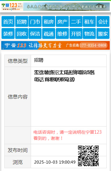 | 防骗提醒: | 宁晋123(www.nj123.cc)提醒您:手工活、网络兼职、刷单,都是骗子!凡以各种名义收取费用的都是骗子!找工作是往兜里挣钱,让你往外掏钱的都是骗子!异地招聘请提高警惕,谨防诈骗! |