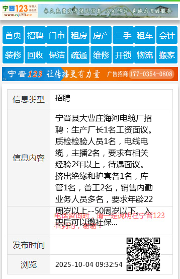 宁晋县大曹庄海河电缆厂招聘:生产厂长1名工资面议。质检检验人员1名,电线电缆,主播2名,要求有相关经验2年以上,待遇面议。挤出绝缘和护套各1名,库管1名,普工2名,销售内勤业务人员多名,要求年龄22周岁以上--50周岁以下。入职后可以缴社保。联系电话:13171859557电话5567077 【电话咨询时,请一定说明在宁晋123看到的,谢谢!】 |