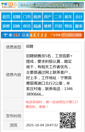 | 防骗提醒: | 宁晋123(www.nj123.cc)提醒您:手工活、网络兼职、刷单,都是骗子!凡以各种名义收取费用的都是骗子!找工作是往兜里挣钱,让你往外掏钱的都是骗子!异地招聘请提高警惕,谨防诈骗! |