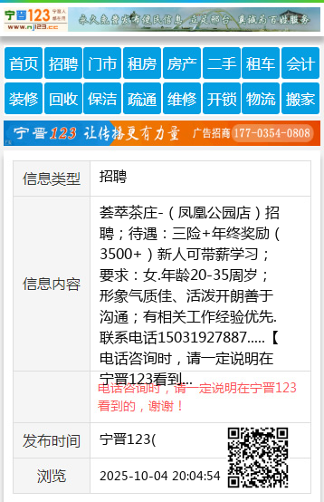 荟萃茶庄-(凤凰公园店)招聘;待遇:三险+年终奖励(3500+)新人可带薪学习;要求:女.年龄20-35周岁;形象气质佳、活泼开朗善于沟通;有相关工作经验优先.联系电话15031927887..... 【电话咨询时,请一定说明在宁晋123看到的,谢谢!】 |
