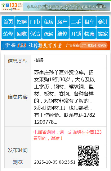 苏家庄孙羊盃外贸仓库。招女采购19到30岁,大专及以上学历,钢材、螺纹钢、型材、板材、卷钢。各种各样的,对钢材非常有了解的,对河北钢材工厂也很熟悉,有工作经验。联系电话17821209778 【电话咨询时,请一定说明在宁晋123看到的,谢谢!】 |