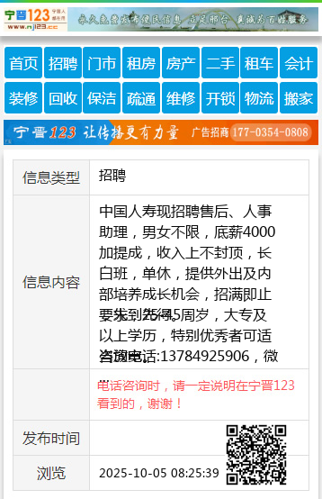 中国人寿现招聘售后、人事助理,男女不限,底薪4000加提成,收入上不封顶,长白班,单休,提供外出及内部培养成长机会,招满即止,先到先得。