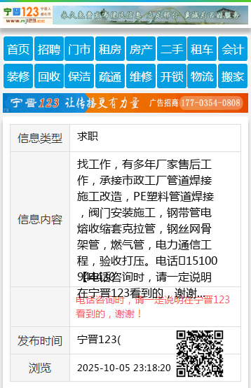 找工作,有多年厂家售后工作,承接市政工厂管道焊接施工改造,PE塑料管道焊接,阀门安装施工,钢带管电熔收缩套克拉管,钢丝网骨架管,燃气管,电力通信工程,验收打压。电话15100944430