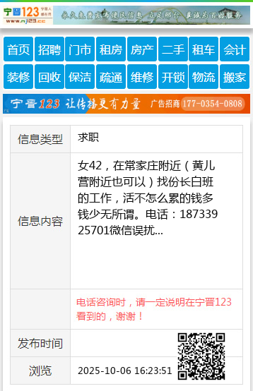 女42,在常家庄附近(黄儿营附近也可以)找份长白班的工作,活不怎么累的钱多钱少无所谓。电话:18733925701微信误扰 【电话咨询时,请一定说明在宁晋123看到的,谢谢!】 |