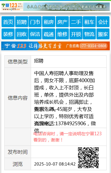 中国人寿招聘人事助理及售后,男女不限,底薪4000加提成,收入上不封顶,长白班,单休,提供外出及内部培养成长机会,招满即止,先到先得。