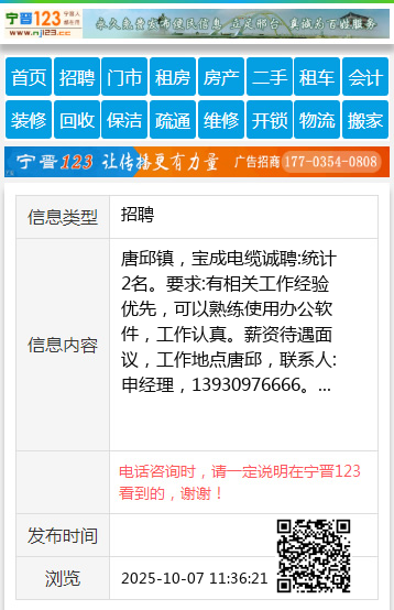 唐邱镇,宝成电缆诚聘:统计2名。要求:有相关工作经验优先,可以熟练使用办公软件,工作认真。薪资待遇面议,工作地点唐邱,联系人:申经理,13930976666。
