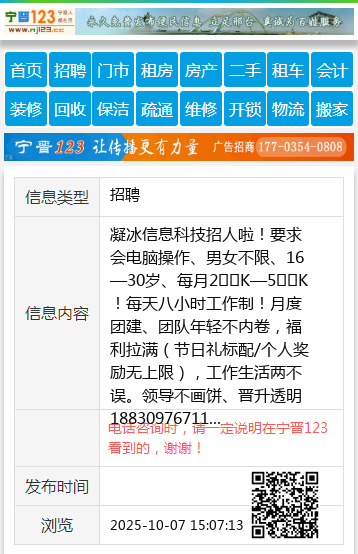 凝冰信息科技招人啦!要求会电脑操作、男女不限、16—30岁、每月2️⃣K—5️⃣K!每天八小时工作制!月度团建、团队年轻不内卷,福利拉满(节日礼标配/个人奖励无上限),工作生活两不误。领导不画饼、晋升透明18830976711 【电话咨询时,请一定说明在宁晋123看到的,谢谢!】 |