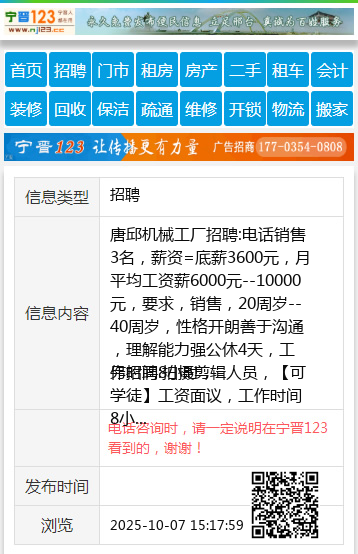 唐邱机械工厂招聘:电话销售3名,薪资=底薪3600元,月平均工资薪6000元--10000元,要求,销售,20周岁--40周岁,性格开朗善于沟通,理解能力强公休4天,工作时间8小时,