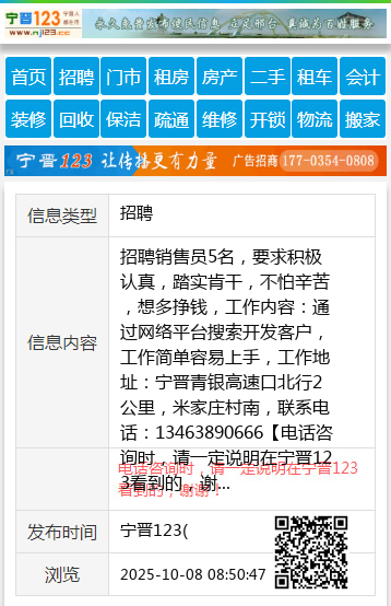 招聘销售员5名,要求积极认真,踏实肯干,不怕辛苦,想多挣钱,工作内容:通过网络平台搜索开发客户,工作简单容易上手,工作地址:宁晋青银高速口北行2公里,米家庄村南,联系电话:13463890666 【电话咨询时,请一定说明在宁晋123看到的,谢谢!】 |