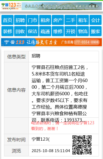 宁晋县石柱粮点招普工2名,5.8米B本货车司机1名短途运输,普工工资第一个月6000,第二个月转正后7000,大车司机薪资6000,包吃住。要求岁数45以下,要求有工作经验。具体位置高德搜宁晋县丰兴粮食种植有限公司,联系电话:13933737991王 【电话咨询时,请一定说明在宁晋123看到的,谢谢!】 |