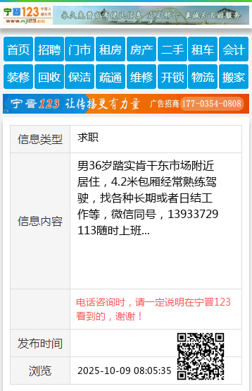 男36岁踏实肯干东市场附近居住,4.2米包厢经常熟练驾驶,找各种长期或者日结工作等,微信同号,13933729113随时上班 【电话咨询时,请一定说明在宁晋123看到的,谢谢!】 |